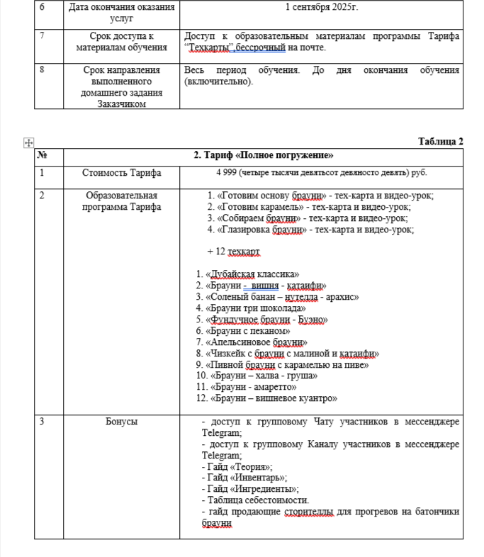2.3. Онлайн-курс - совокупность последовательно выстроенных учебно-методических материалов (видео-уроков, файлов, текстов, аудио- фото-, графических материалов и иных объектов интеллектуальной собственности), связанных одной темой и направленных на передачу информации Заказчику от Исполнителя по образовательной программе «Батончики брауни» в соответствии с выбранным Тарифом (далее - Курс). Курс проводится на базе образовательной платформы «Геткурс 2.0.» и мессенджера Telegram.